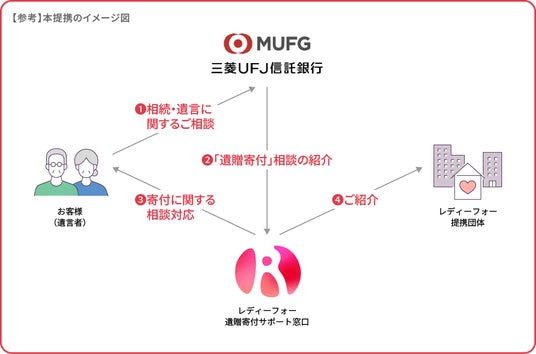 本協定では、三菱UFJ信託銀行が遺贈寄付を検討されているお客さまのご希望に応じて「レディーフォー 遺贈寄付サポート窓口」を紹介し、当窓口では、寄付先候補として公益団体等のご案内・マッチングを行います*1。