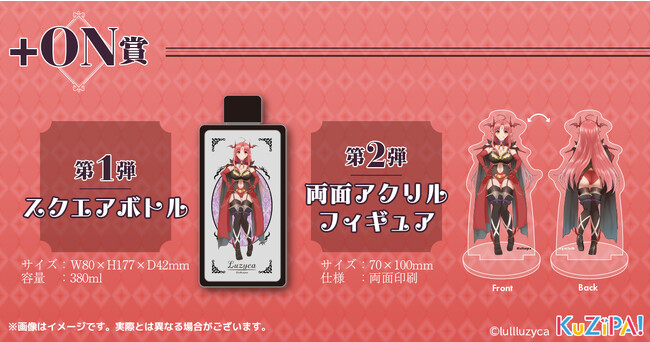 くじを引くごとに自動抽選にて豪華景品ゲットのチャンスがある「+ON賞」では、スクエアボトルと両面アクリルフィギュアがそれぞれ10名の方に当たります。いつもよりちょっとだけ悪くてちょっとだけ強い女幹部「ルル=ルチカ」の限定グッズをお求めください。