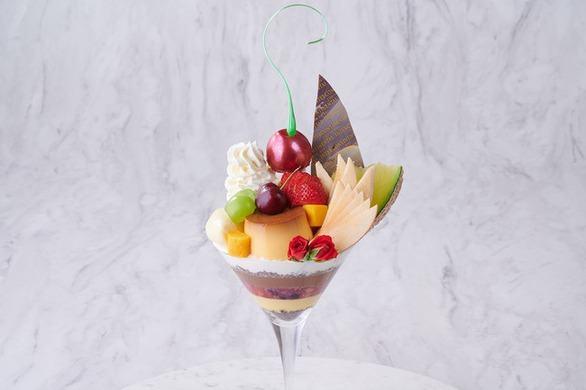 贅沢に7種の旬のフルーツを使用し、サクランボをイメージした艶やかな飴細工をデコレーションし、昔ながらのプリンアラモードを現代風のパフェにアレンジいたしました。トップには、美しくカットされたリンゴ、マンゴー、シャインマスカットなどの季節のフルーツや、ひんやりとしたバニラアイスと、コクがありまろやかな口当たりの生クリームをたっぷりのせて華やかに仕上げました。なめらかなプリンの豊かな風味とフレッシュなフルーツが織りなすハーモニーをお楽しみいただけます。