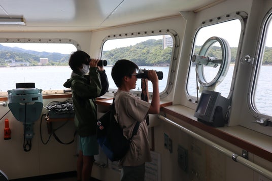 参加者が船橋から双眼鏡を覗いて海を見ている様子