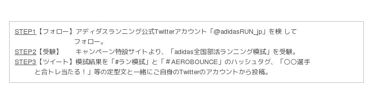 また、「AERO BOUNCE(エアロバウンス)」の発売に伴い、全国の部活動生を対象とした「adidas 全国部活ランニング模試」キャンペーン〈2017年7月10日(月)~2017年9月3日(日)〉を実施いたします。様々なスポーツでの基礎練習となるランニングをテーマに、部活動生にとって身近な「模試」形式で問題を出題し、正しいランニング・トレーニング知識と正しいシューズの選び方を「解答」として提供します。問題は「サッカー部」「野球部」「バスケットボール部」など、部活ごとに異なる全10問で構成されており、アディダス契約アスリートや日本代表コンディショニングトレーナーなどが監修し、それぞれのスポーツに適した内容となっています。