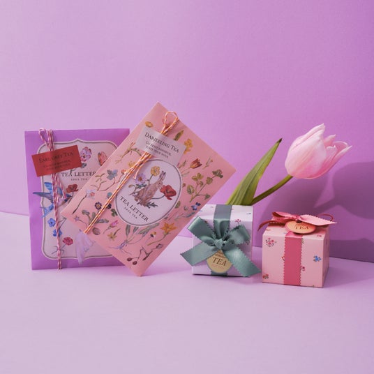ティーレター(PL/アールグレイ、PK/ダージリン) 各¥540、リボンティーボックス(GR/アールグレイティー、PK/ピーチティー) 各¥648
