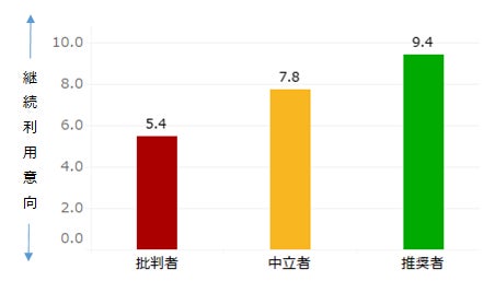 該当の旅行会社の利用者に対し、今後の継続利用意向を0~10の11段階でたずねたところ、 「推奨者」(推奨度が「9」~「10」の回答者)は平均9.4ポイント、「中立者」(推奨度が「7」~「8」の回答者)は平均7.8ポイント、「批判者」(推奨度が「0」~「6」の回答者)は平均5.4ポイントとなり、推奨度が高いほど継続利用意向も高くなる結果となりました。