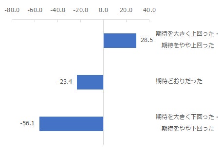 該当の旅行会社での旅行を終えて、プランや提案が期待どおりの内容であったか調査したところ、「期待を大きく上回った」、「期待をやや上回った」と回答した利用者は合わせて28.6%となりました。また期待に対する評価別にNPSも分析したところ「期待を大きく上回った・期待をやや上回った」と回答した利用者のNPSは28.5ポイントとなり、他の利用者よりも高くなりました。