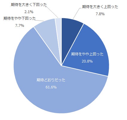 「期待を大きく上回った」もしくは「期待をやや上回った」と回答した利用者にその理由を自由記述で調査したところ、「想像以上に幅の広い提案をしてもらえた」(30代男性)、「子供がいるプランでよりいい旅館をさがしてくれた」(30代女性)、「オプションが自社にないときに、他社のオプションを勧めてくれた」(50代男性)といった販売員の提案力の高さや、「ツアーの際に添乗員の対応が凄くよく気持ちが良く旅行ができたから」(40代女性)、「添乗員や現地スタッフの臨機応変な対応がよかった」(60代以上女性)、といった添乗員などの現地スタッフの対応力に対する評価、また「WEB面談での相談が便利で、問い合わせをすればかなり早いタイミングでレスポンスが得られたため」(40代男性)といった、問い合わせの良さについて評価する声が多くみられました。