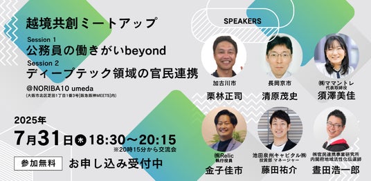 事業共創カンパニーである株式会社Relic(本社:東京都渋谷区、代表取締役CEO:北嶋 貴朗、以下「Relic」)は、株式会社官民連携事業研究所と共催で、「越境共創サロン」オープニング記念セミナー「【越境共創ミートアップ】公務員の本音x民間の本音」を開催します。開催日時は2025年7月31日(木)18:30から、会場は大阪市北区のNORIBA10 umedaです。