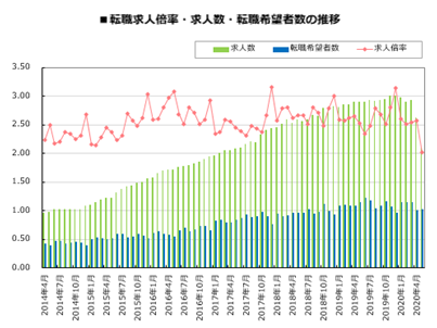 2020年5月の転職求人倍率は、前月比-0.55ポイントの2.03倍となりました。求人数は前月比79.9%、前年同月比72.3%となりました。転職希望者数は前月比101.4%、前年同月比90.2%でした。