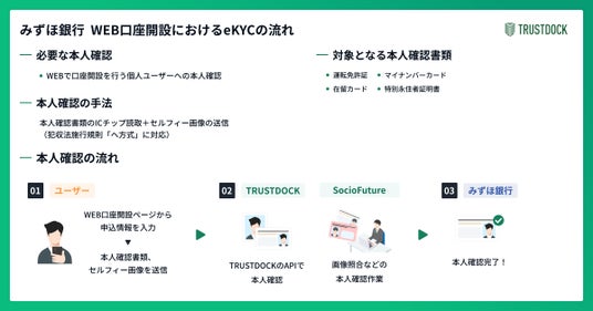 株式会社TRUSTDOCK(本社:東京都中央区、代表取締役:千葉 孝浩)はSocioFuture株式会社(本社:東京都港区、代表取締役 社長執行役員:菅原 彰彦)とともに、株式会社みずほ銀行(本店:東京都千代田区、取締役頭取:加藤 勝彦)のWEB口座開設において、犯罪収益移転防止法(以下、犯収法)施行規則「ヘ方式」に対応するeKYC(オンライン本人確認)サービス「TRUSTDOCK」のプランを追加提供を開始いたしました。