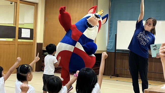 6月14日(水)に「おおきなわ」の活動の一環として、キングスマスコットのゴーディーがホームタウン沖縄市にある『愛の星保育園』へ訪問し、4歳児と5歳児のクラスの園児たち27名と交流会を実施しました。