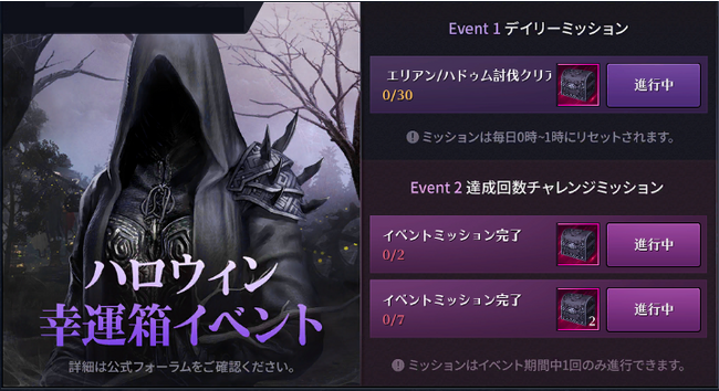 イベント期間中、指定されたイベントミッションを毎日クリアすると、イベントページより「呪術の根源」や「混沌の結晶」が多数手に入る「ハロウィン幸運箱」や「ハロウィンボーナス箱」を獲得することができます。詳細は以下URLをご参照ください。