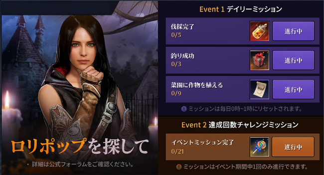 イベント期間中、毎日イベントミッションをクリアすると、イベントページより「光輝の聖水:大型」1個やイベントアイテム「酸っぱ~い!ロリポップ」などの報酬を獲得することができます。詳細は以下URLをご参照ください。