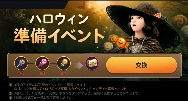 イベント期間中に他イベントから、「酸っぱ~い!ロリポップ」「甘~い!ロリポップ」「ハロウィンキャンディー(カボチャ味)」を獲得することができ、獲得したアイテムを当イベントページにて「交換」ボタンをタップすると「タリシからのお礼」と交換することができます。