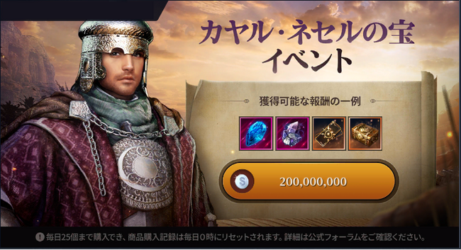 イベント期間中、イベントタブより様々なアイテムを獲得できる「カヤル・ネセルの宝」を購入できます。