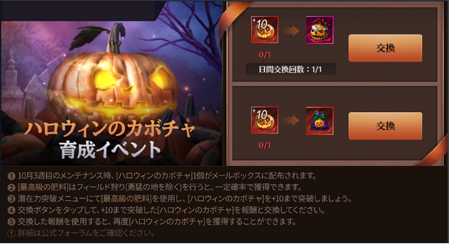 本イベント開始時にメールボックスへ「ハロウィンのカボチャ」が配布されます。イベント期間中、フィールド狩りにより一定確率でドロップする強化材料アイテム「最高級の肥料」を使用し、「ハロウィンのカボチャ」を+10まで強化すると、イベントページから「アクラド」などのアイテムが手に入る「上質のカボチャ」「カボチャの巾着」と交換することができます。 「上質のカボチャ」「カボチャの巾着」を開封すると、一定確率でのアイテム獲得と共に「ハロウィンのカボチャ」を再度獲得できますので、お好みの構成アイテムを何度でも入手可能です。詳細は以下をご参照ください。