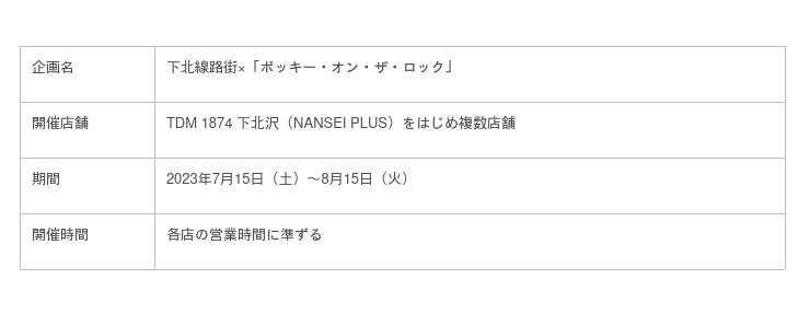 東京・下北線路街の各施設にある飲食店とコラボレーションし、オリジナルの「ポッキー・オン・ザ・ロック」メニューを展開します。