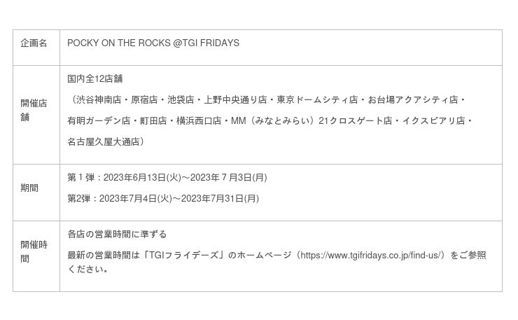 ※コラボレーションの最新情報は、「ポッキー・オン・ザ・ロック」キャンペーンサイトや「ポッキー」公式SNS、「TGIフライデーズ」公式ホームページ (https://www.tgifridays.co.jp/)をご確認ください。