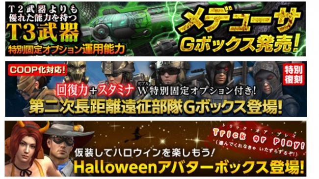 9月15日(火)メンテナンス後より、武器の様々な能力がアップする運用能力がついた新T3武器Gボックス「メデューサシリーズ」や、ハロウィンにぴったりの仮装できる「Halloweenアバターボックス」、W特別固定オプションがついた特別復刻版の防具Gボックスの販売を開始いたしました。新T3武器Gボックス「メデューサシリーズ」の6個セットをご購入いただいた方には、強化に必要な素材アイテム「ボルテックスナノチューブ」を購入日の翌日にもらえる特別キャンペーンも開催しておりますのでぜひお見逃しなく。