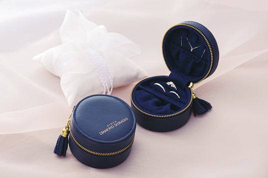 挙式やインテリアなどでご使用いただける、花をモチーフにした可愛らしいリングピロー。もしくは、3本のリングやネックレス、小物も入れられる収納力抜群のジュエリーポーチのどちらかをお選びいただけます。