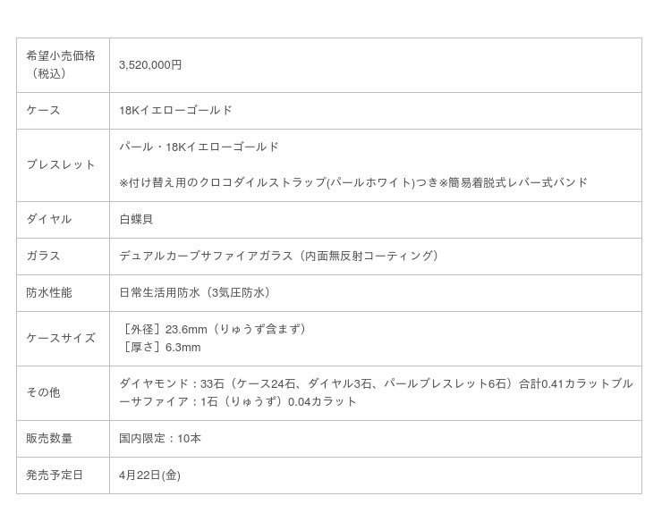 セイコーウオッチ株式会社(代表取締役社長:内藤 昭男、本社:東京都中央区)は、高級ウオッチブランド<クレドール>の人気シリーズ「Linealx(リネアルクス)」より、日本ブランドならではのパールブレスレットの数量限定モデルを4月22日(金)より発売いたします。希望小売価格は3,520,000円(税込)です。