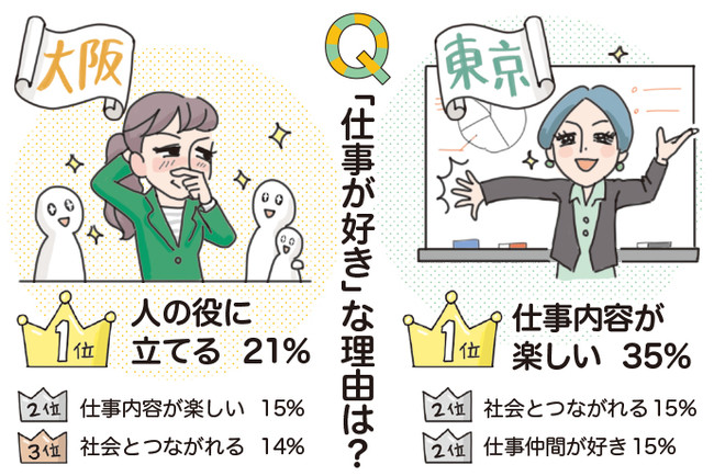 「仕事が好き」な理由について質問すると、大阪は、人情の街を思わせる「人の役に立てる」という回答が第一位に。東京は、「仕事内容が楽しい」というコメントが最も多く寄せられました。