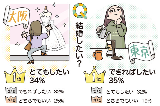 未婚女性を対象に今後の結婚願望について質問すると、大阪では、「とてもしたい」が34%で最も多く票を集め、次に「できればしたい」が32%という結果に。「どちらでもいい」と回答した人が25%、「できればしたくない」が6%、「絶対にしたくない」が9%という結果が出ました。