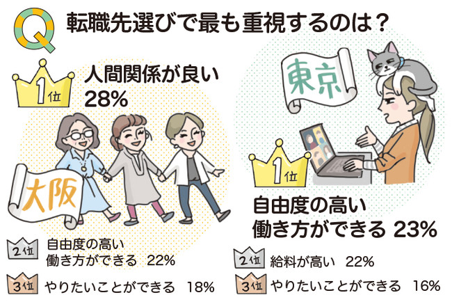 ・転職先選びで重視するポイントに違い。「人間関係がいい(大阪)」「自由度の高い働き方ができる(東京)」