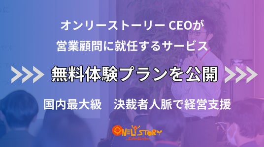 審査制・決裁者マッチングプラットフォーム「ONLY STORY」「チラCEO」(サービスサイト:https://onlystory.co.jp/ )を運営する株式会社オンリーストーリー(代表取締役:平野哲也、本社:東京都渋谷区)は、当社CEOが営業顧問に就任する新サービスの無料体験プランをリリースいたします。