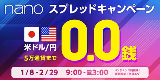 nano米ドル/円 9:00-翌3:00 5万通貨までスプレッド0.0銭キャンペーン
