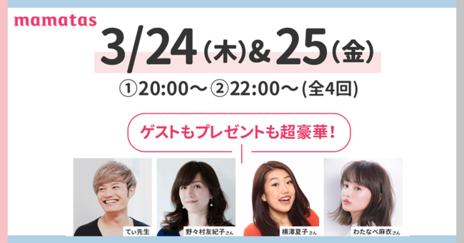C Channel株式会社(本社:東京都目黒区/代表取締役社長:森川亮)が運営するママ向け動画メディア「mamatas(以下、ママタス)」(総フォロワー数110万以上・https://www.mamatas.net/ )のLIVE配信・ママタスfesが本日2022年3月24日~25日に開催されます。「令和ママの新常識」をテーマに、令和の新しい時代に新しい価値観を持って子育てや家事、仕事に取り組むママを応援するLIVE配信です。