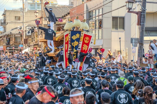 だんじりは「曳き手」「鳴り物」「大工方」「前梃子」「後梃子」、合わせて500~1,000人ほどで曳行します。重さ4tにもなる巨大なだんじりをスムーズに動かすために人々が一丸となる姿は、祭りの見どころの一つです。勢いよく走りながら、直角にだんじりの向きを変える豪快な「やりまわし」は最大の見どころと言えるでしょう。彼らは長期間にわたる練習や準備を通じて絆を深め、曳行にあたっての体力を作り、危険な場面を突破する勇気を鍛えます。そして、全員の呼吸が合って初めて「やりまわし」が成功します。地域一致団結の力が岸和田祭りを300年間支えていることが伝わる迫力の場面です。巨大なだんじりの曳行には危険も伴い、痛ましい事故も歴史に刻まれていますが、それでも岸和田市民の熱い思いは変わりません。祭囃子が聞こえれば、祭りに繰り出さずにはいられないのです。だんじり祭りは、岸和田市民にとっての誇りであり、人々の絆であるからです。こうしてだんじり祭りの伝統は、親から子へ、子から孫へと受け継がれています。