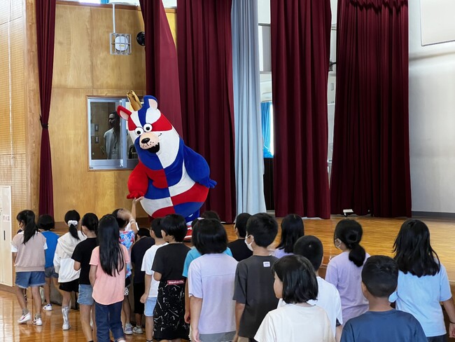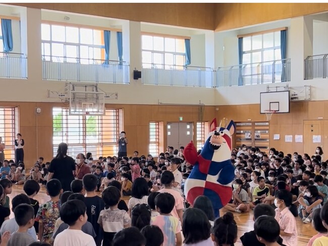6月15日(木)に「おおきなわ」の活動の一環として、琉球ゴールデンキングスのマスコットのゴーディーがホームタウン沖縄市にある「高原小学校」へ訪問し、音楽朝会(校歌コンクール)の特別審査員として参加しました。