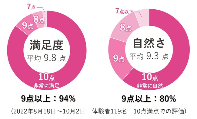 上記の技術を組み合わせることで、動きのある顔上で自然なメイクを短時間でいくつも試すことのできるメイクシミュレーター「COLOR MACHINE」を完成させました。こちらは2022年8月17日からコンセプトストアMaison KOSÉ銀座にて“ビューティアトラクション”として展開しており、これまで実際に体験したお客さまからは高い評価を得ています。10月集計時点までに体験した119名を対象としたアンケートでは、10点満点中で満足度が平均9.8点(9点以上が94%)、自然さが平均9.3点(9点以上が80%)となっており(図2)、メイクアップ商品を選ぶ過程を楽しんでいただけていることや、違和感のない自然なメイクが再現できていることが裏付けられました。
