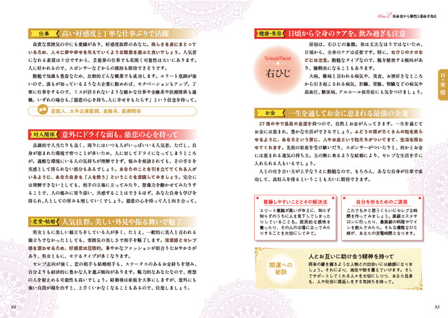 気になる人との相性や、日・月・年ごとの運勢も、簡単に導き出せるようになっています。丁寧な解説がほどこされているので、ビギナーさんにもぴったりの作品です。
