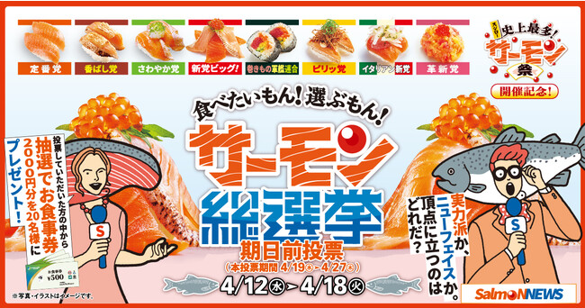 また、『サーモン祭』の開催を記念して実施する「サーモン総選挙」は、商品の特徴に合わせて“香ばし党”や“さわやか党”、“巻きもの軍艦連合”など様々な“党・連合”に分けられたサーモン商品の中から、お客さまのお好きなサーモン商品に投票いただくと、抽選でお食事券が当たるキャンペーンです。