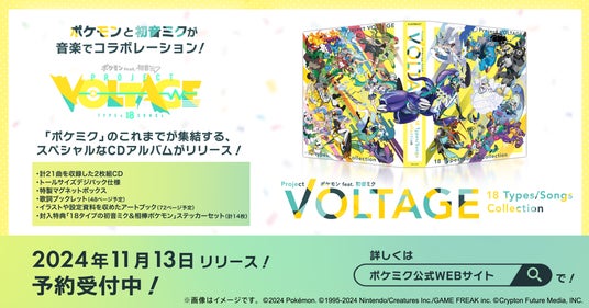 クリプトン・フューチャー・メディア株式会社(本社:北海道札幌市、代表取締役:伊藤博之、以下クリプトン)が展開するバーチャルシンガー『初音ミク』と、株式会社ポケモン(本社:東京都港区六本木、代表取締役社長:石原恒和)がプロデュースする『ポケットモンスター』(ポケモン)によるコラボプロジェクト「ポケモン feat. 初音ミク Project VOLTAGE 18 Types/Songs」(以下「ポケミク」)の一環で、2024年11月13日(水)にオリジナルCD『ポケモン feat. 初音ミク Project VOLTAGE 18 Types/Songs Collection』をリリースいたします。ポケモンセンター、雪ミク スカイタウンを含む一部店舗では、予約特典もご用意しております。人気ボカロPをはじめとしたたくさんのクリエイターたちによって紡がれ、累計7,200万回以上の再生を突破した「ポケミク」シリーズの21曲が集結したスペシャルなCDアルバムを、ぜひお手元にお迎えください。