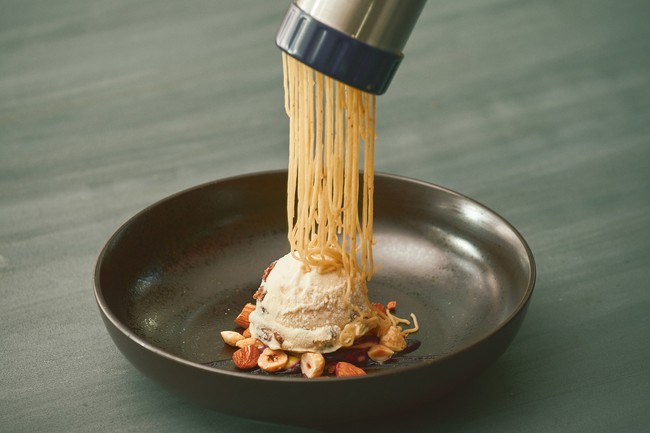 目の前で仕上げる「生絞り 和栗モンブラン」もオプションにてご用意。塩ミルクアイスとカシスソースを合わせることで甘過ぎない大人の味わいに仕上げました。出来立てのフレッシュなモンブランをぜひご賞味ください。