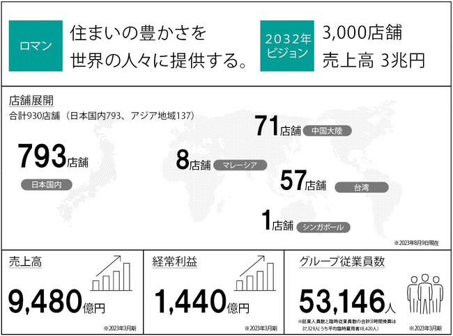 ニトリグループは、「住まいの豊かさを世界の人々に提供する。」というロマン(志)、2032年3,000店舗、売上高3兆円を達成するというビジョンを掲げています。
