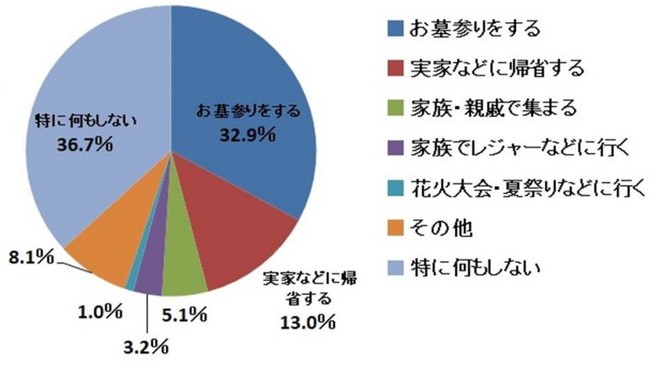 お盆期間の過ごし方で一番多いのは「特に何もしない」で36.7%。何かをする人の中では「お墓参りをする」人が最も多くて32.9%でした。次に多いのは「実家などに帰省する」が13%でした。