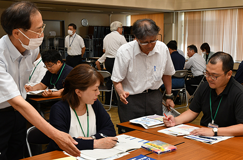 7月8日(月曜日)には、本市で災害の危険性が高まった際、避難情報の発令を判断する危機管理室職員を中心に、災害時に適切かつ迅速に対応ができるよう防災研修会を開催。アドバイザーを務める太田佳似氏、實本正樹氏の助言のもと、大雨を想定した様々な防災気象情報等が発表されるなか、情報を分析し、改善を図った判断基準に沿って、河川氾濫に対する避難情報発令をどのタイミングで判断するかなど実践的なワークショップを行いました。