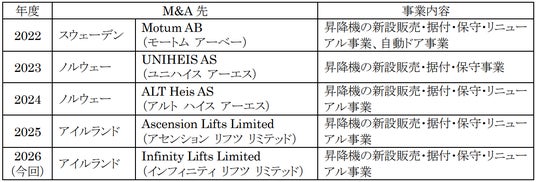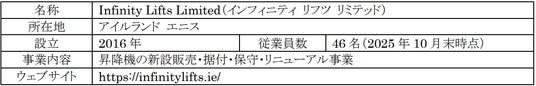 今回の買収は、2025年4月のAscension Lifts社に続くアイルランドでの2件目の買収となります。本買収により、Ascension Lifts社が長年培った他社製品の据付・保守技術や首都ダブリンにおける顧客基盤に、当社製品にも精通したInfinity Lifts社が有する高度な技術力や同国内での広範な販売網を掛け合わせることで、幅広いお客様に対してメーカーを問わないあらゆるニーズにワンストップで応える体制の構築を目指します。この両社のシナジーを通じて、アイルランドにおける安定的な事業基盤を強化するとともに、欧州全体の昇降機事業の拡大戦略を推進します。