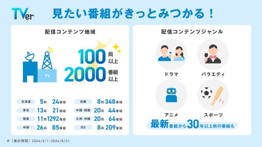 ※1:2024年8月1日~8月31日における、TVer単体のVOD・リアルタイム配信・追っかけ再生およびSPLIVEを合計した全デバイスでの動画再生数(ビデオリサーチにて算出)