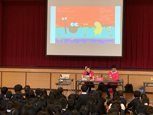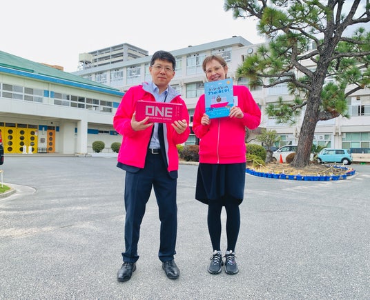 絵本作者のキリーロバ・ナージャ氏(写真右)と、Ocean Network Express広報チームの小堺祐樹氏(写真左)。宇品小学校にて。