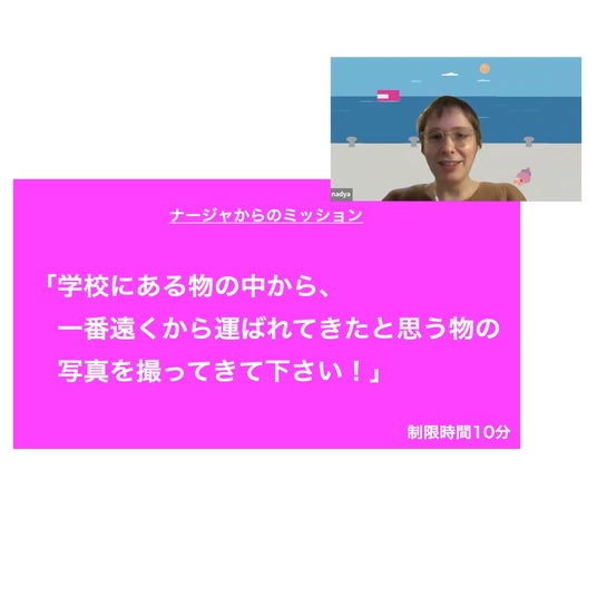 開催の2週間前、ナージャ氏より6年生に向けて、事前課題を告げる”ミッションムービー”を送付。そのミッションは「学校にあるものの中で、一番遠くから運ばれてきたと思うものの写真と、理由を送ってください!制限時間は10分です!」というもの。児童たちは5人1組になり、学校中から一番遠くから来たと思うものを探し、タブレットで写真を撮影。チーム毎に1枚のスライドを作成し、ナージャ氏に送付しました。 その全てについてOcean Network Expressが、どの国から運ばれてきたものなのかを推定し、遠くから来たものランキングを作成。当日の授業を迎えました。