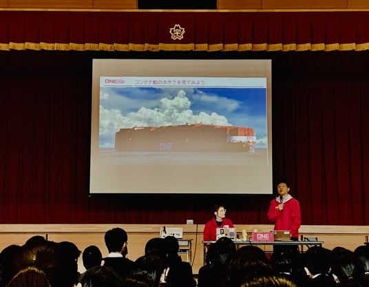 最後に、20世紀最大の発明の1つと称されることもある「コンテナ」がどのように発明され、現在どのように私たちの生活を支えているのかを、Ocean Network Express広報チームの小堺祐樹氏が紹介。コンテナ一個で何本のバナナが運べるか? コンテナ船の大きさは宇品小学校と比べるとどれくらいか? などのクイズを交えた説明は、児童たちも先生方も興味津々で聞き入りました。