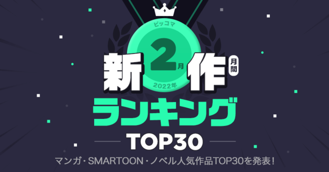 「ピッコマ新作月間ランキングTOP30」は2022年2月1日~2022年2月28日までの期間内にWEBピッコマ内で集計された2022年2月の月間ランキングです。ランキングにカウントされている作品は続刊を含まない、2022年2月に配信が開始された作品が対象となっており、マンガ部門・SMARTOON部門・ノベル部門で、各人気TOP30位までの作品がラインアップなれております。