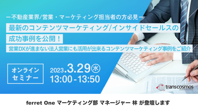 そこで今回、トランスコスモス社で営業を統括する原氏と、BtoBマーケティング領域のプロである『ferret One』のマーケティングマネージャーを務める林が、「不動産業界における最新営業DX事例」や「BtoB企業のコンテンツ作成のためのターゲット設定方法とコンテンツの作り方のコツ」について解説いたします。