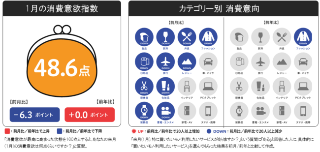 2021年1月の消費意欲指数は48.6点。前月比-6.3ptの低下、前年比±0.0ptで同スコアとなっています。