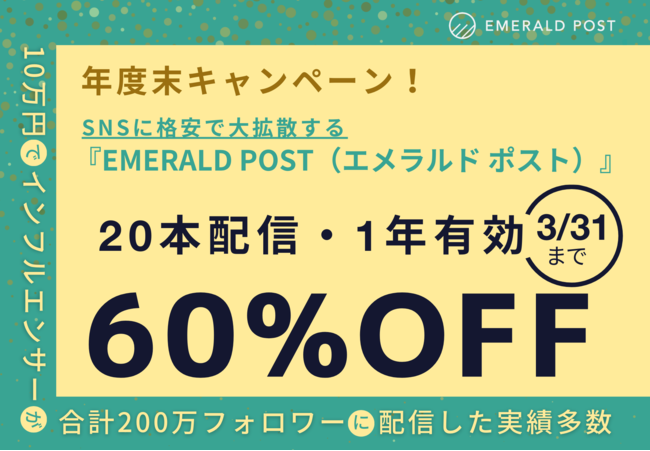 インフルエンサーマーケティング事業を展開するLIDDELL株式会社(本社:東京都港区、代表取締役:福田 晃一、以下リデル)は、SNSに向けたPR情報配信サービス『EMERALD POST(エメラルド ポスト)』https://service.liddell.tokyo/function/emeraldpost/ の20本配信パックを、2023年3月31日(金)までのお申し込みにて、通常200万円のところ、60%OFFの80万円にてご提供致します。また、2023年2月28日(火)までのお申し込みなら【5本追加】致します。