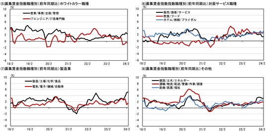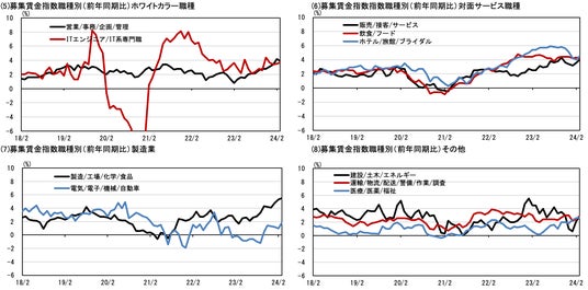 - 職種別募集賃金の前年比は2月と比べて上昇、横ばい、減少がまちまちになっている。