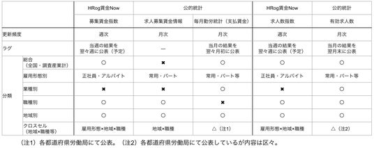 <労働市場に関する公的統計と「HRog賃金Now」との比較対照表>